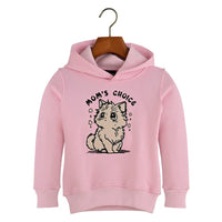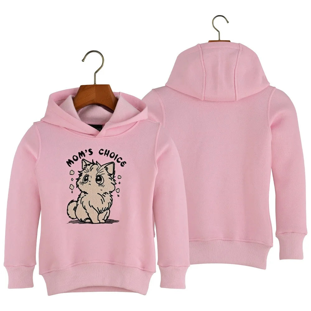 Cozy up in our adorable pink hoodie, featuring a charming cartoon cat design that's sure to delight cat lovers and moms alike! The soft, light pink fleece fabric and comfortable fit make it perfect for lounging around or running errands. The fun design showcases a sweet cat surrounded by hearts and diamonds, with the phrase 'MOM'S CHOICE' written above it in bold black letters. Made with high-quality fleece material and a relaxed fit, this hoodie is available in sizes for ages 4, 6, 8, and 10 years—perfect for young style lovers. Whether you're a mom, a cat enthusiast, or just someone who loves a good hoodie, this is the perfect choice!