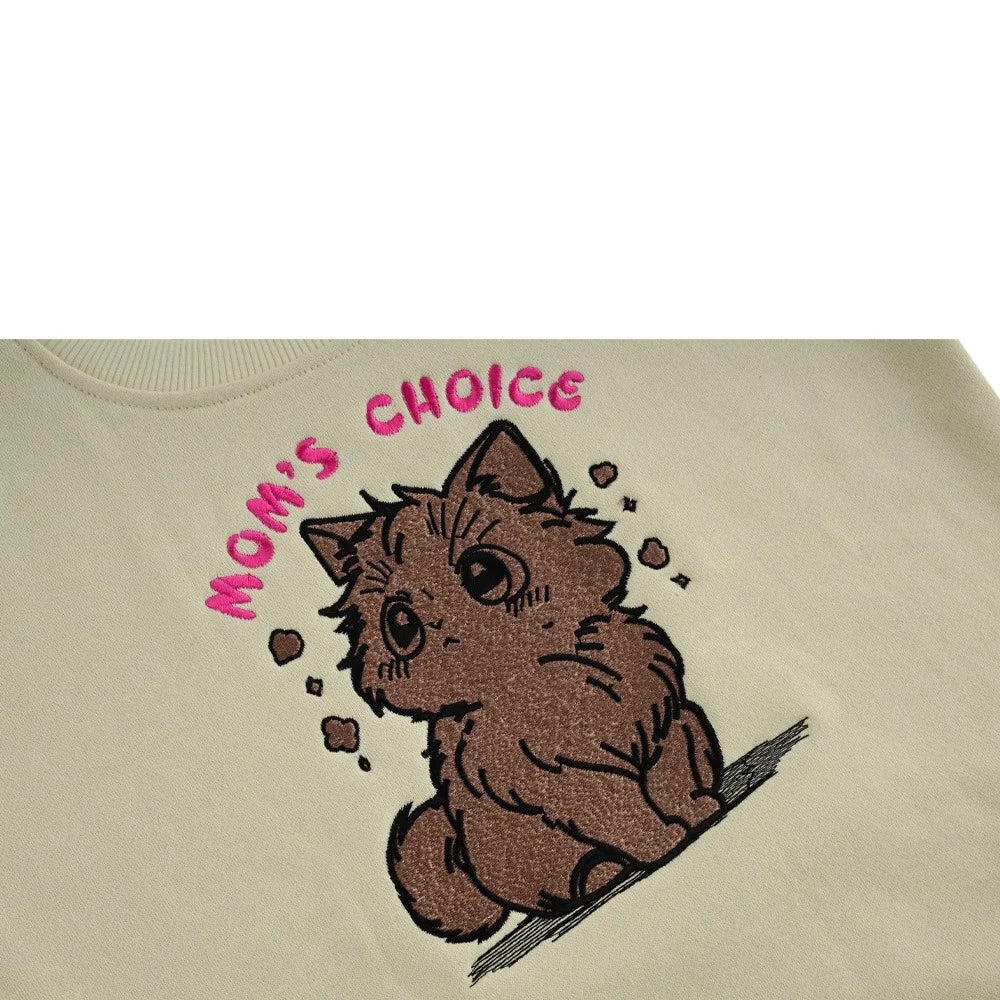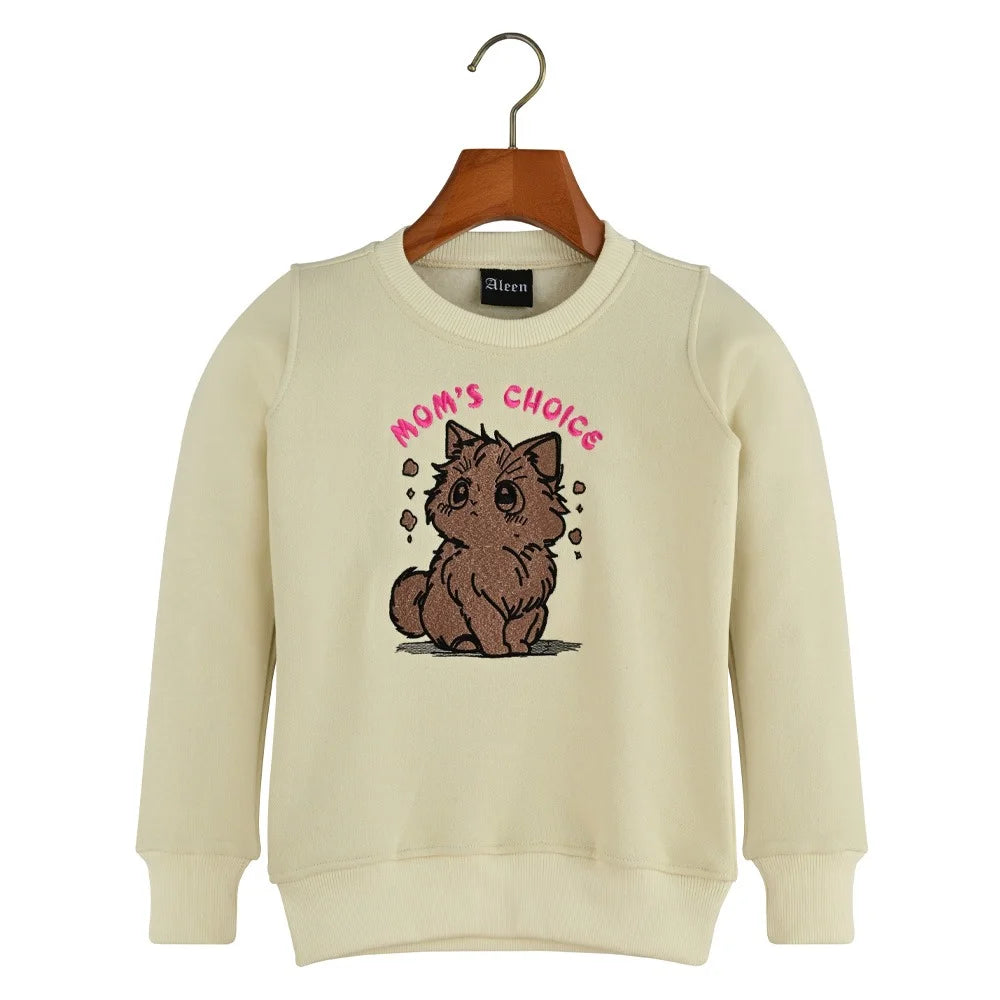 Elevate your casual style with our cream-colored sweatshirt, featuring a playful cartoon cat design that's sure to bring a smile to your face! The adorable brown cat is surrounded by the phrase 'MOM'S CHOICE' in bold pink letters, adding a touch of whimsy to this comfortable and cozy sweatshirt. Crafted from soft, high-quality fleece fabric, it offers a warm and plush feel—perfect for cooler days. Designed in a relaxed fit, it's ideal for lounging around or running errands. Available in sizes for ages 4, 6, 8, and 10 years, it’s perfect for young style lovers. The simple yet stylish design makes it a great addition to any wardrobe, and the 'Aleen' label on the inside tag ensures a touch of sophistication. Whether you're a cat lover, a mom, or just someone who appreciates a good sweatshirt, this is the perfect choice!